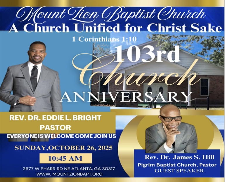 On Sunday, we will celebrate our 103rd Church Anniversary. Our Speaker, Rev. Dr. James Hill, Pastor of Pilgrim Baptist Church in Atlanta. Come out as we thank, praise, and worship God for what He has done!