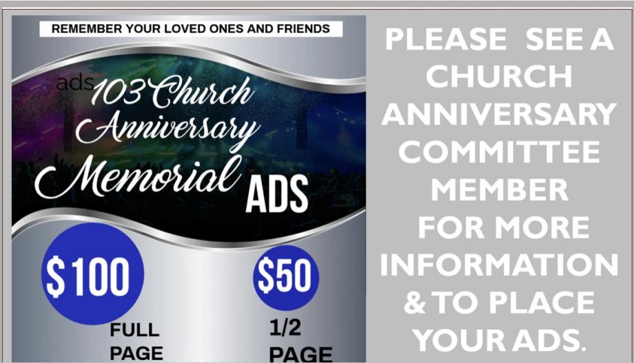 Secondly, I am asking that you take out a regular ad for our 103 Church Anniversary Souvenir Booklet. This can be a Ministry ad, a business ad, or a congratulatory ad.
