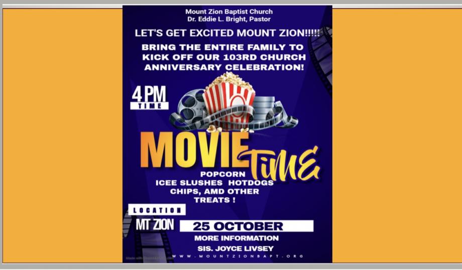 Today at 4:00 pm- we will kick off our Church Anniversary with Movie Time for everyone. A movie has been selected for all adults and one for our Youth. Along with Movie night, we will have food, other treats, and of course- popcorn.